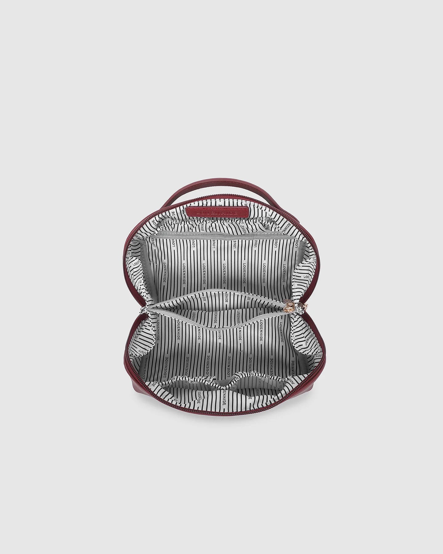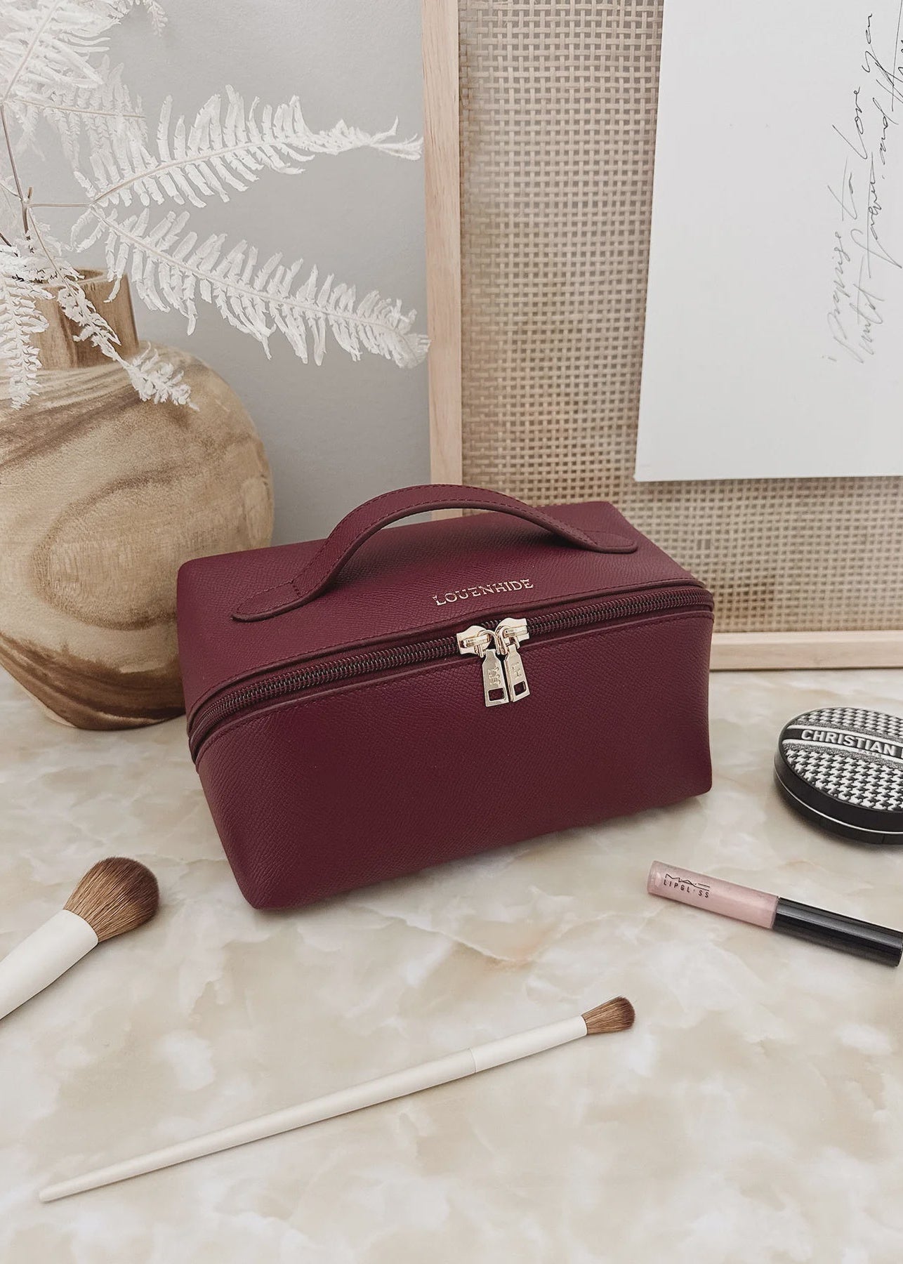 The Ellis Burgundy Makeup Bag is a compact beauty organiser designed for effortless access and convenience. Crafted from buttery soft vegan leather and accented with gold hardware, she blends functionality with a refined finish. With her wide opening and clever silhouette, Ellis lies completely flat when unzipped, so every product is visible and within easy reach. Inside, two main compartments, a zip pocket, and three slip pockets create designated spaces for your makeup, brushes, and skincare, keeping everything neatly in place. Perfect for jetsetters or anyone who loves an organised vanity, Ellis pairs perfectly with the larger Orion Cosmetic Case for a complete travel set.