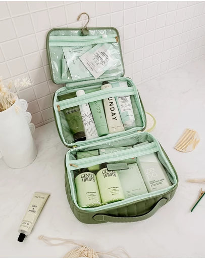 The Louenhide Maggie Cosmetic case is a beautiful quilted large toiletries bag. Designed to be functional and spacious with three clear zipped compartments to store your makeup, skincare, and toiletries all in one. This hanging cosmetic bag is designed with a hook to easily use while travelling. Take with you on weekend adventures or around the world!