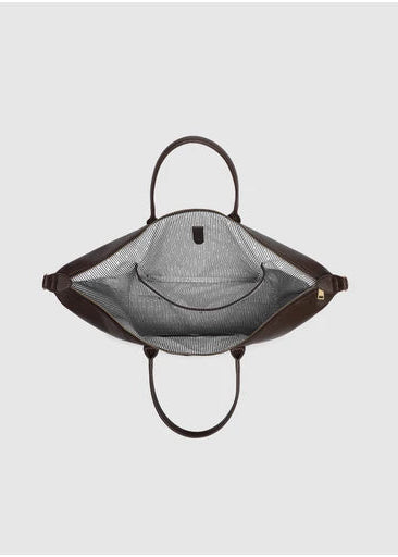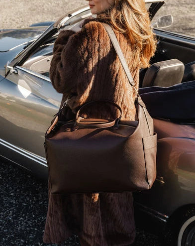 The Ohio Chocolate Overnight Bag is a sleek unisex overnight bag designed for weekends away, business trips, or short getaways. Made from smooth vegan leather, her compact rectangular silhouette is perfectly sized to fit in overhead compartments while offering a spacious interior for all your travel necessities. A secure zip closure keeps belongings safe, while two external slip pockets provide quick access to items on the go. Thoughtfully detailed with light gold hardware, Ohio also includes a clear cosmetic pouch to store toiletries and prevent spills. Designed with versatility in mind, she can be carried three ways - by the long top handles, over the shoulder with the detachable crossbody strap, or hands-free with the hidden trolley sleeve slipped over your suitcase handle. Equal parts functional and refined, Ohio makes every journey effortless.