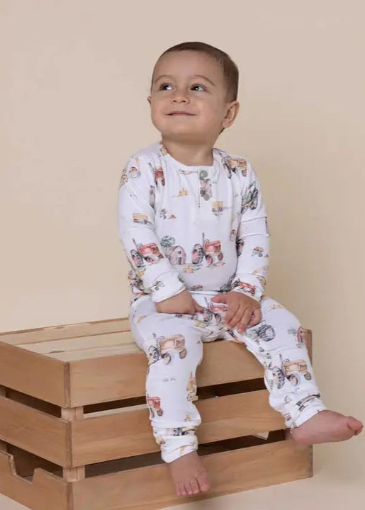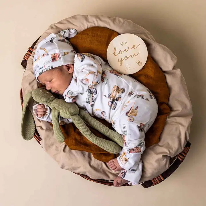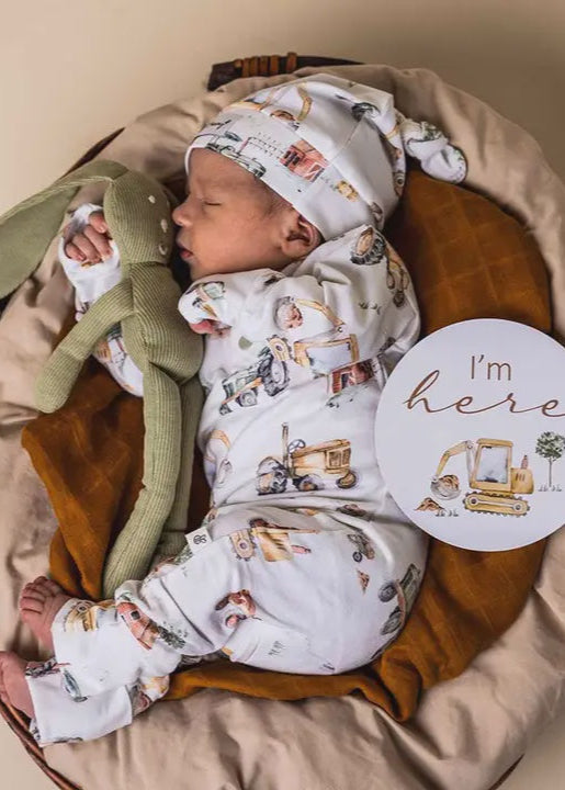 Our Organic Growsuits are an all-in-one onesie that is both functional and beautiful. Soft and stretchy, our growsuits are an easy-care, fuss-free option that’s easy to wear thanks to their modern, fitted style. Suitable for loungewear, daywear, birth announcement photos and they make great baby gifts. All Snuggle Hunny clothing is made with GOTS Certified Organic Cotton CU 1182228. Diggers is part of our Country collection. Our Growsuit Design This design includes a long, hidden zipper from ankle to ankle, inside the leg. This means bub’s body can stay warm while their nappy is being changed, with simple, easy access. It also means these growsuits are as easy as a T Shirt to put on bub!