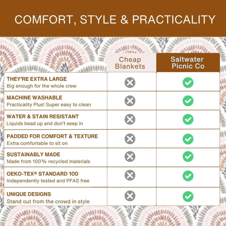 Peacock, like all Saltwater Picnic Co. rugs is sustainably crafted using recycled materials that are water, stain and sand resistant while also being machine washable.