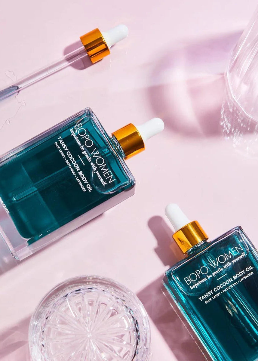 Our Tansy Cocoon Body Oil features a blend of restorative and deeply calming natural ingredients. Blue Tansy, a rare Moroccan essential oil, creates our body oil's sapphire hue and this blend also features coconut oil, sweet almond oil, lavender oil, mandarin oil and patchouli. These oils have been chosen specifically for their dual benefits of relaxing the body while calming inflamed, irritated or dry skin. Perfect for all skin types. Can also be used as a bath oil and on the ends of your hair.