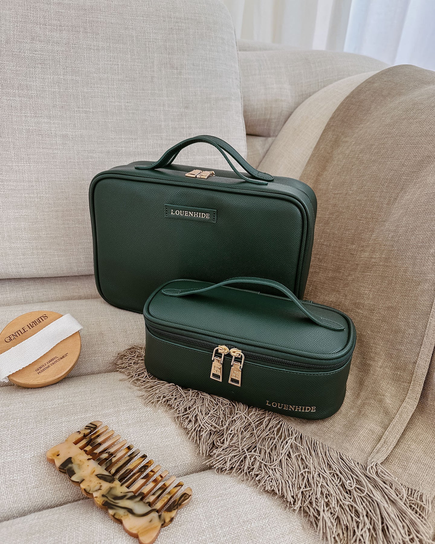 The Louenhide Georgie Fifi Forest Green Cosmetic Bag Set is a perfect travel companion, offering an elegant and organisational solution for a weekend getaway or overnight stay. The structured flat base and top handle opening of the Fifi Cosmetic Case allows for easy access to your products and enables effortless transportability. The internal zip compartments of the Georgie Cosmetic Case are a practical way to ensure all of your cosmetics are organised efficiently and stored safely. The combination of these two beautiful cases will make packing a breeze! *Please note the smaller Fifi Case has tassel zip pulls as depicted in the studio images.